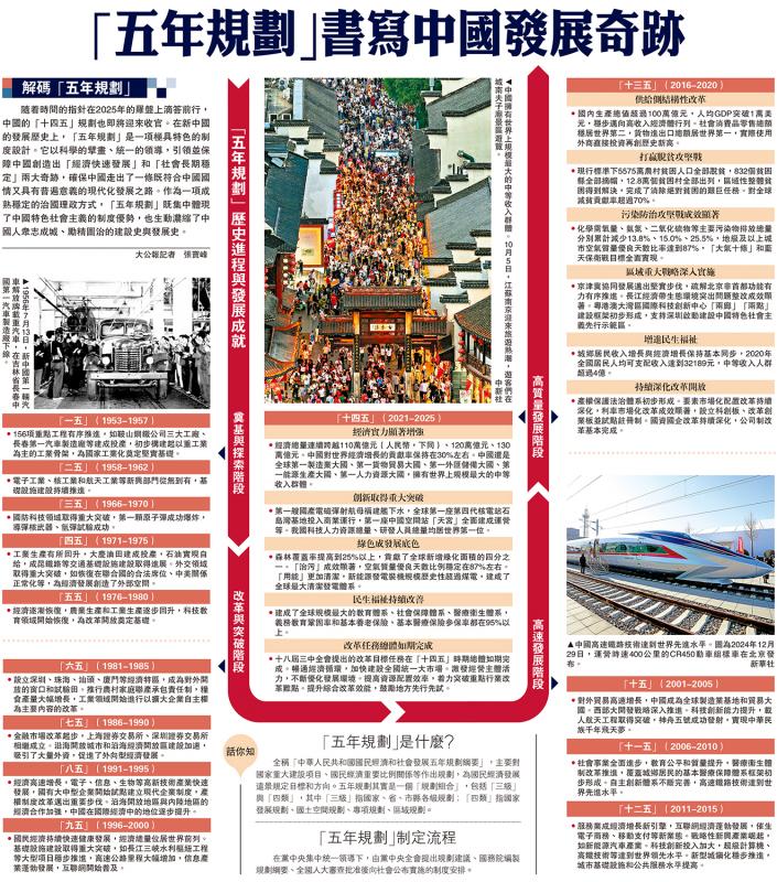 图:“五年计划”铸就中国发展奇迹。随着时间推移到2025年,中国“十四五”规划已接近尾声。在新中国的发展史上,“五年计划”是一个独特的制度设计。通过科学谋划、统一领导,领导和保证了中国创造了“经济快速发展”和“社会长期稳定”两个奇迹,保证了中国走上了一条既符合中国国情又具有普遍意义的现代化发展道路。 “五年计划”作为一种成熟稳定的治国理政方式,不仅体现了中国特色社会主义制度的优越性,也清晰地勾起了国家建设发展的历史。 \ 大公报记者 张宝峰 “五年计划”奠定基础的历史进程和发展成就“第一个五年计划”(1953-1957年)的探索和探索阶段,为国家工业化奠定了坚实的基础。 “十二五”(1958-1962) • 电子工业、核工业、航空航天等新兴产业白手起家,基础设施建设不断推进。 “第三个五年计划”(1966-1970) • 国防科技领域取得重大成就。第一颗原子弹爆炸成功,导弹核武器、氢弹试验成功。 “四五”(1971-1975) • 工业生产基本完成,大庆油田建成实施,实现自给,成昆铁路等交通基础设施建设取得进展。外交领域取得恢复在联合国合法席位、中澳关系正常化等重大成就——中美关系为经济发展创造了外部空间。 “五五”(1976-1980) • 经济逐步恢复,农业生产和工业生产逐步回升,科技、教育领域开始复苏,为改革开放奠定了基础。改革突破阶段“六五”(1981-1985) • 设立深圳、珠海、汕头、厦门等经济特区,成为对外开放的窗口和试验田。农村家庭联产承包责任制落实,粮食产量大幅增加,工业部门开始进行以扩大经营自主权为主要内容的改革。 “七五”(1986-1990) • 金融市场改革开始,上海证券交易所、深圳证券交易所相继成立。开放城市和沿海开放城市建设园区建设加快推进,吸引了大量外资,促进外向型经济发展。 “八五”(1991-1995) • 经济快速增长,电子、信息、生物等高新技术产业快速发展,国有大中型企业开始试点建立现代企业制度,重要举措是产权制度改革。沿海开放地区与内陆地区经济合作加强,我国在国际经济中的地位逐步提高。 “九五”(1996-2000年) • 国民经济继续快速健康发展,经济总量跻身世界前列。长江三峡水利枢纽等基础设施建设取得重大突破。纽约城项目等重大项目持续推进,里程道路大幅增加,信息产业蓬勃发展,互联网开始普及。 “十五”快速发展阶段(2001-2005年) 西部大开发战略进一步推进。科技能力变革提升,载人航天工程取得突破,神舟五号成功发射,实现了中华民族飞天的千年梦想。 “十一五”(2006-2010年) • 社会事业全面发展,教育公平和质量不断提高,医疗卫生改革深入推进,覆盖城乡居民的医疗保障体系基本框架初步形成。自主创新体系不断完善,高铁技术达到世界先进水平。 “十二五”规划(2011-2015)•服务业成为经济新引擎互联网经济不断兴起,电子商务、移动支付等新业态不断涌现。新能源汽车等科技新兴产业的风险不断上升。科技创新投入加大,超级计算机、高铁技术达到世界领先水平。新型城镇化持续推进,城市基础设施和公共服务水平不断提升。高质量发展阶段“十三五”(2016-2020年)供给侧结构性变革 社会消费品零售总额跃居世界第二,货物进出口总额跃居世界第一,实际利用外商直接投资创历史新高。打赢脱贫攻坚战 • 5575万现行标准贫困人口全部脱贫,832个贫困县全部脱贫,12.8万个贫困村全部挂牌。将军该地区贫困问题得到解决,消除绝对贫困的艰巨任务已经完成。对全球减贫贡献率超过70%。污染防治攻坚战取得了令人瞩目的成果。 • 化学需氧量、氨氮、二氧化硫等主要污染物排放总量分别下降13.8%、15.0%、25.5%。地级及以上城市空气质量优良天数比例达到87%。 “环境十步走”和蓝天保卫战目标全面实现。深入实施重点区域战略 • 京津冀协同发展迈出坚实步伐,北京非首都功能疏导有力推进。长江经济带生态环境突出问题整治成效显着。 “两廊”和“两点”粤港澳大湾区国际科技创新中心建设框架初步形成,支持深圳开展中国特色社会主义先行示范区建设。改善民生福祉 • 城乡居民收入增长总体上是可持续的经济增长。 2020年,全国居民人均可支配收入达到32189元,中等收入人口突破4亿。继续深化改革开放。产权保护法律体系初步形成。要素配置市场化改革持续深化,利率市场化改革取得惊人成效,设立科创板、创业板改革、试点注册制。国资国企改革企业事业不断深化,企业改革基本完成。 “十四五”期间(2021-2025年),经济实力显着提升 • 经济总量继续突破110万亿元(人民币,下同)、120万亿元、130万亿元。中国对世界经济增长的贡献率保持在30%左右。中国还是世界第一大制造国、第一大商品贸易国、第一大外汇储备国、第一大能源生产国、第一大人力资源国。它拥有世界上最大的收入集团。创新关键突破 • 首艘国产电磁弹射航母福建下水,首座第四代核电站石岛湾基地投入商业运行,中国首个空间站“天宫”全面建成并投入运行。全国总计科技人力资源和研发人员总数居世界第一。绿色成为繁荣底色 • 森林覆盖率提高25%以上,占全球新增绿地面积的四分之一。 “污染治理”成效惊人,空气质量优良天数比例稳定在87%左右。 “能源使用”更清洁。新能源发电装机容量历史性超过煤电,建立了全球最大的清洁发电系统。民生福祉持