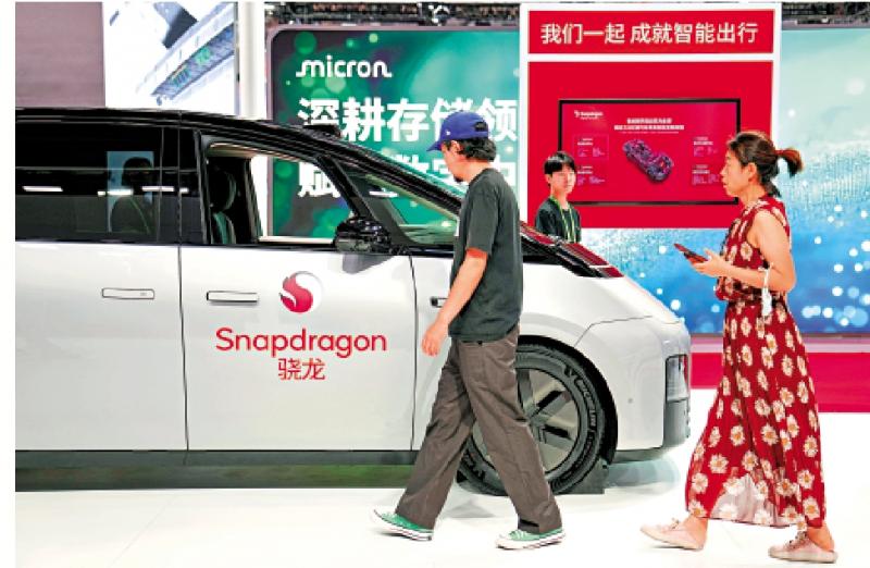 图片:7月17日,嘉宾参观了第三届中国国际供应链推广博览会智能汽车连锁展区的高通展台。 \ 新华社